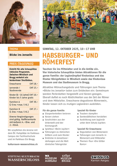 Das nächste Highlight ist das Habsburger- und Römerfest am 12. Oktober. Es findet an vier historischen Schauplätzen statt: beim Legionärspfad Vindonissa und dem Kloster Königsfelden in Windisch sowie im Vindonissa Museum und im Stadtmuseum in Brugg. Hier geht es zum Detailprogramm und zu den Tickets.